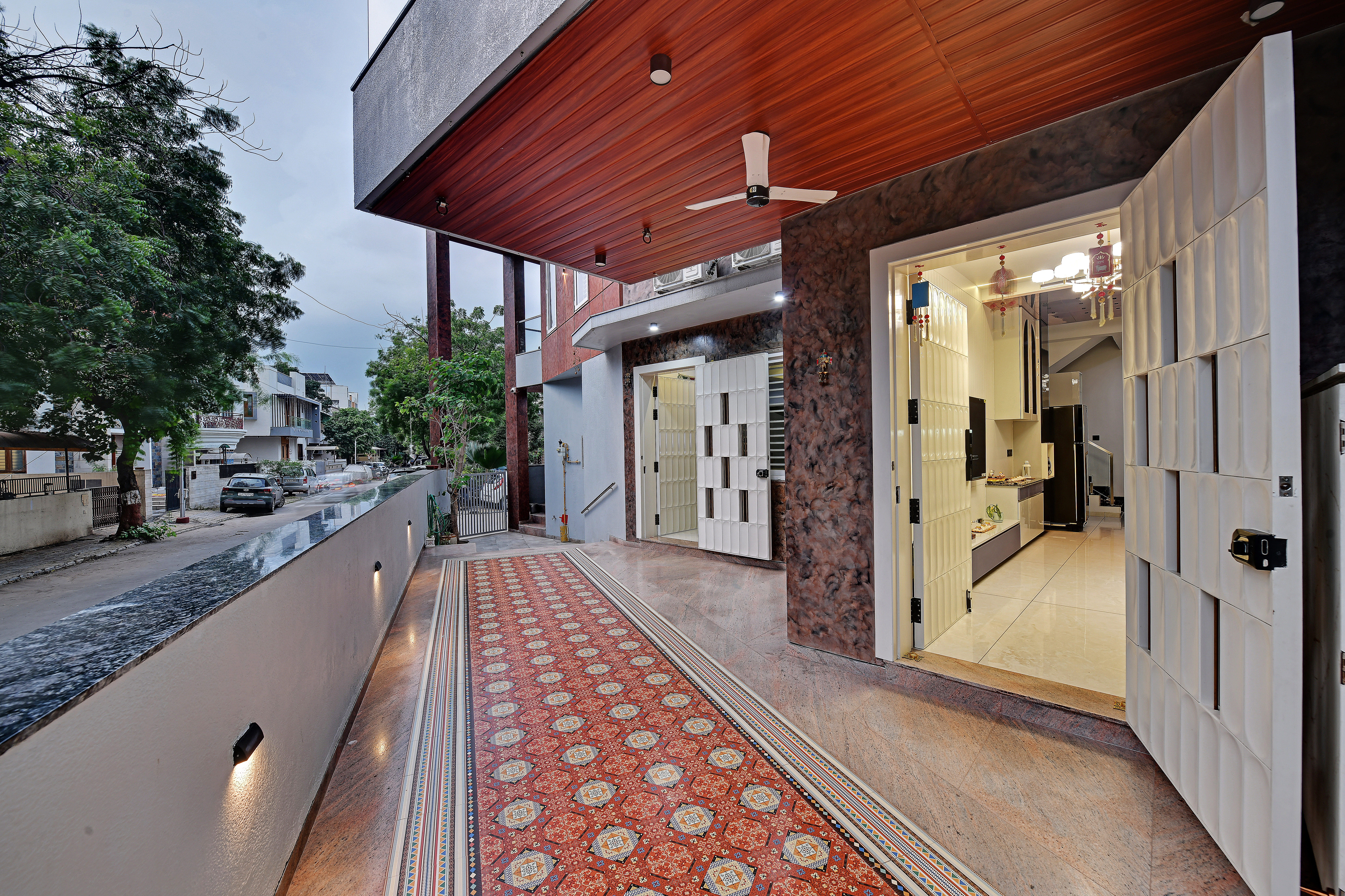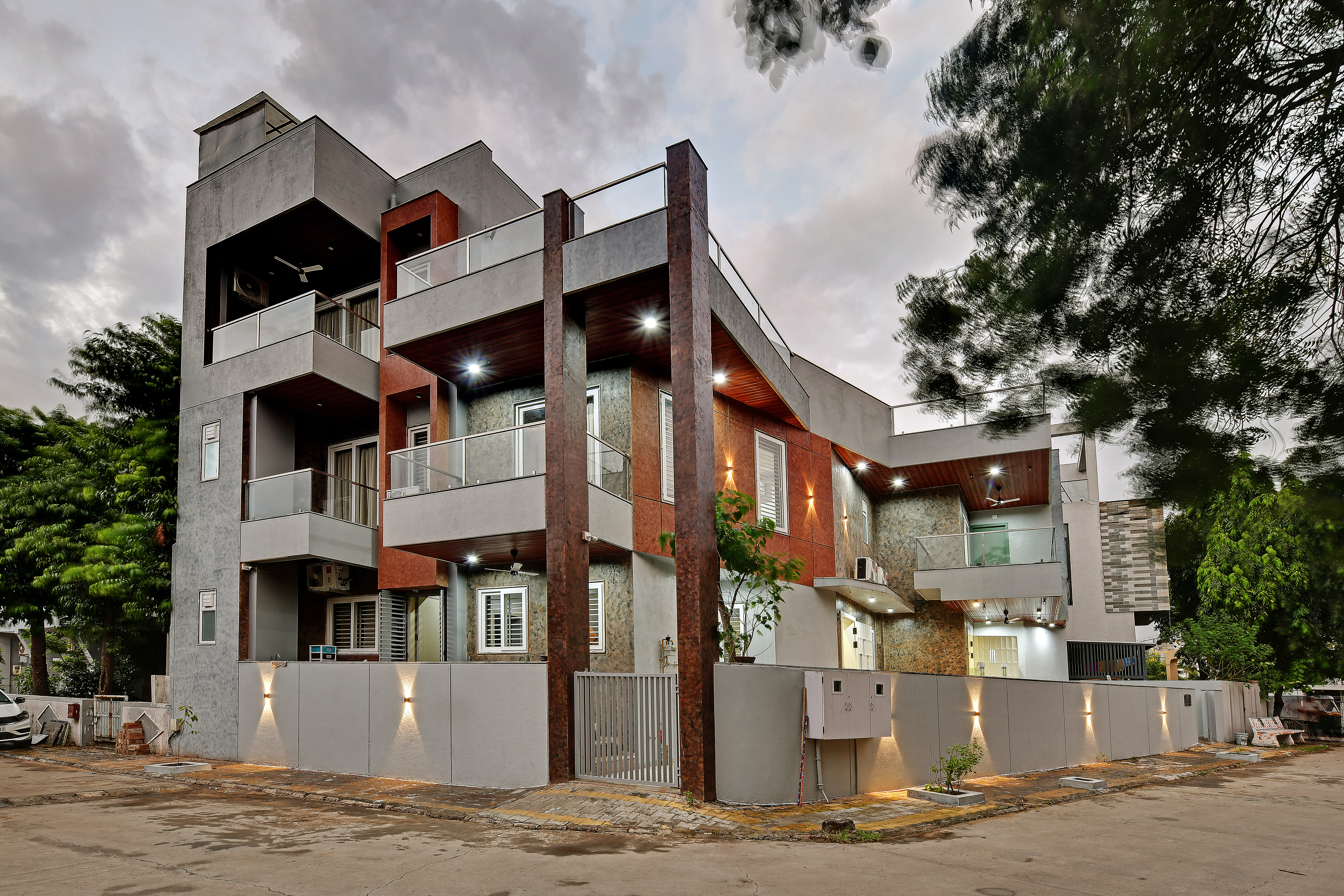 We designed a twin bungalow that beautifully appears as one single bungalow from the outside, creating a seamless and premium visual impact. The elevation features a combination of different textures, enhanced with elegant glass railings that add a modern touch. To elevate the warmth and luxury, wooden ceilings are used in all balconies, enhancing the overall aesthetic appeal. Carefully selected varieties of lighting highlight architectural details and create a soothing, beautiful ambience during the evening. This thoughtful design balances privacy, elegance, and visual harmony—where smart planning meets refined architecture.