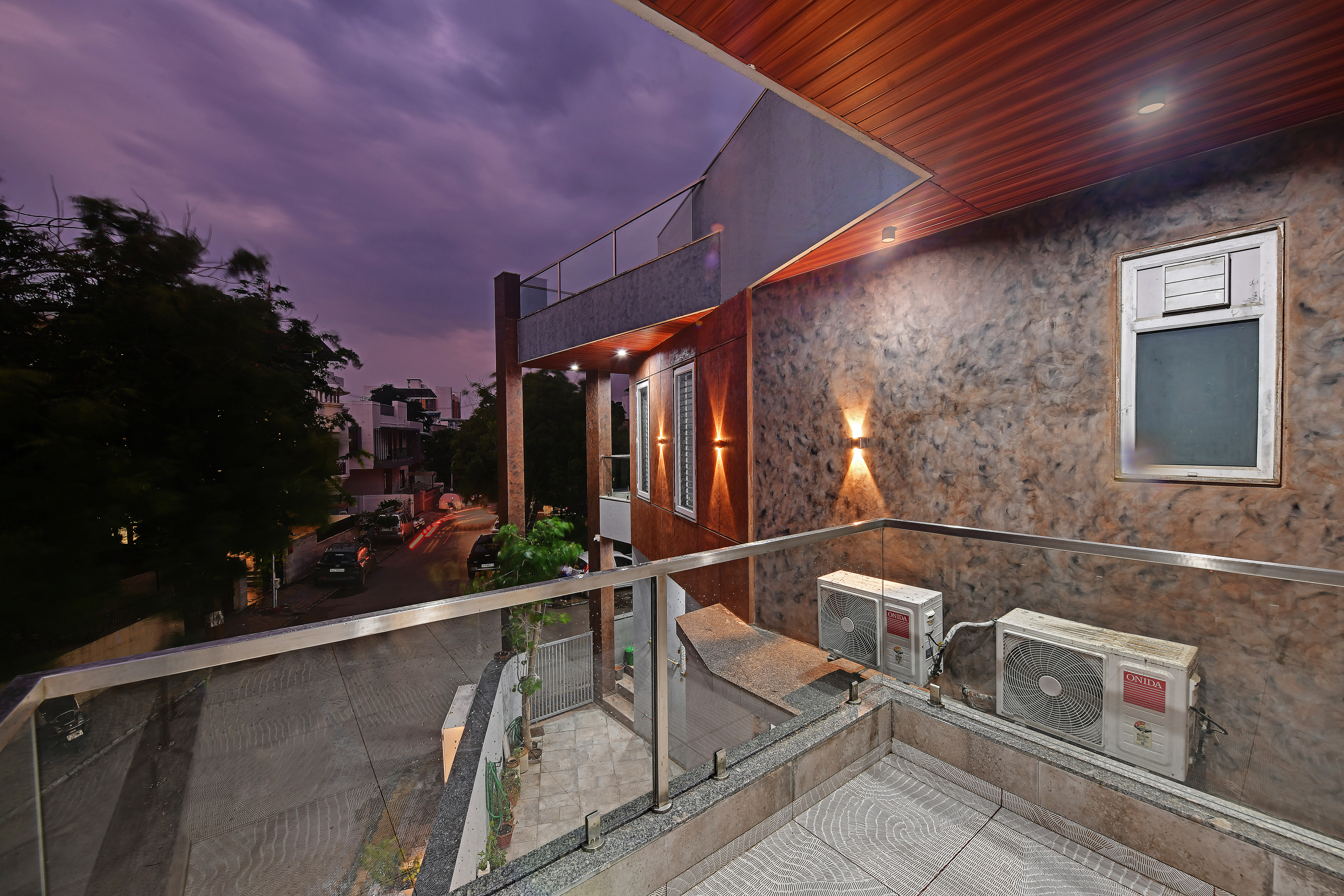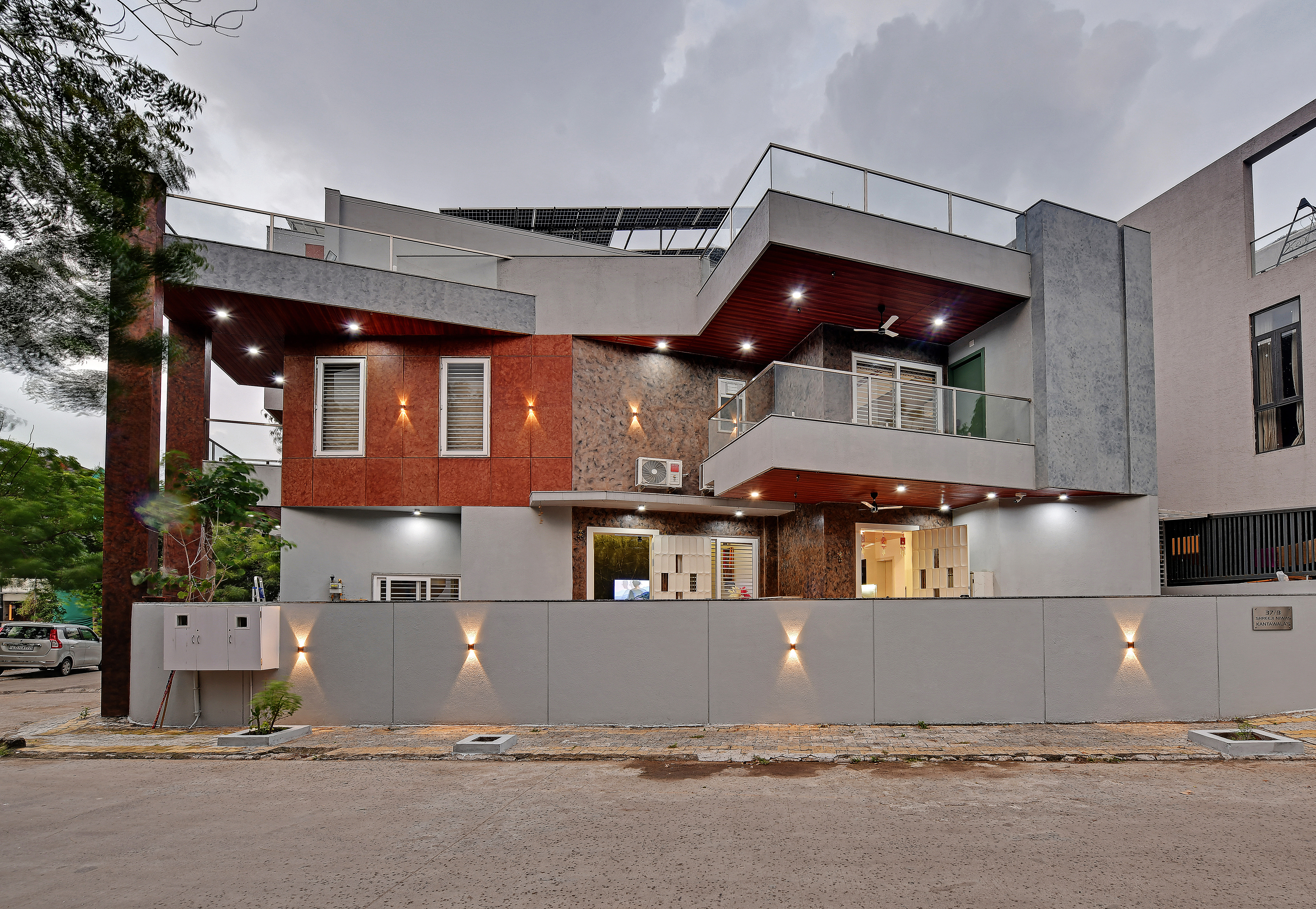 We designed a twin bungalow that beautifully appears as one single bungalow from the outside, creating a seamless and premium visual impact. The elevation features a combination of different textures, enhanced with elegant glass railings that add a modern touch. To elevate the warmth and luxury, wooden ceilings are used in all balconies, enhancing the overall aesthetic appeal. Carefully selected varieties of lighting highlight architectural details and create a soothing, beautiful ambience during the evening. This thoughtful design balances privacy, elegance, and visual harmony—where smart planning meets refined architecture.
